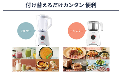 体はそのまま、上部パーツを交換するだけでミキサーとチョッパーを使い分けることが可能(*3)。コンパクトで日常使いしやすいのも魅力です
